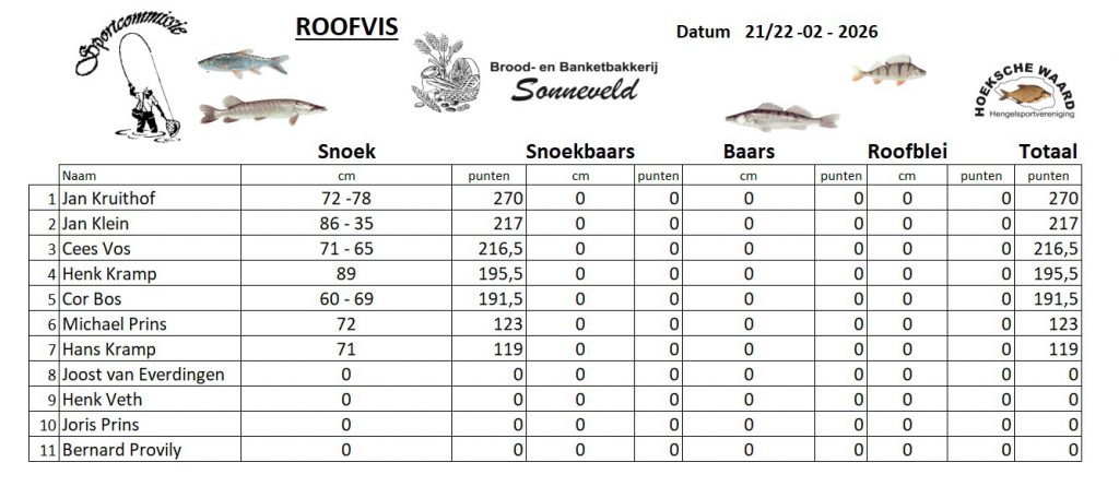 laatste wedstrijd van het eerste gedeelte van het Roofvissen. Jan Kruithof winnaar van het weekend! Geplaatst op 22 februari 2026 door Jeroen Versnel Reageer Geplaatst in Roofvissen, Uitslagen