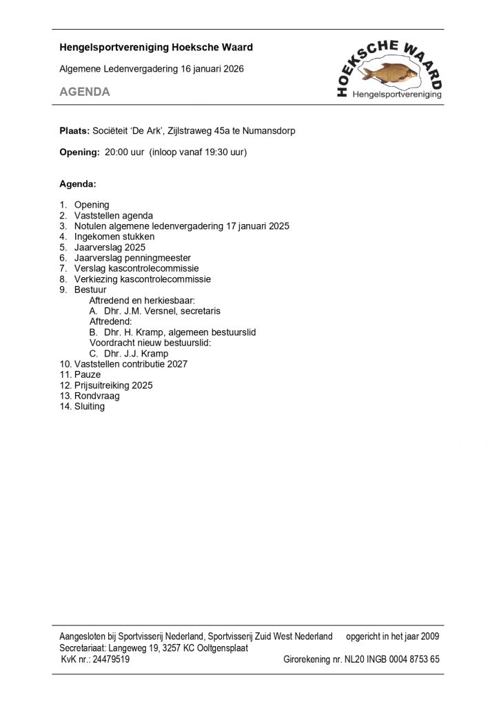 Hierbij nodigen wij u uit voor de algemene ledenvergadering van hengelsportvereniging Hoeksche Waard.