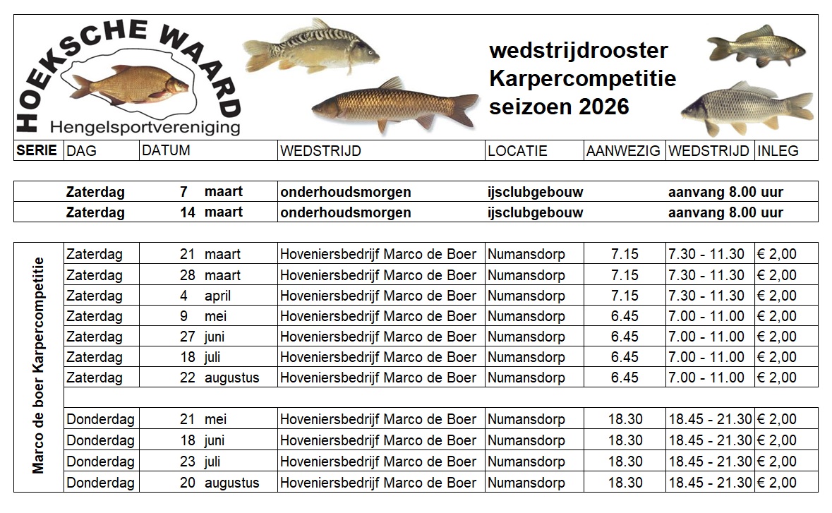 De karperwedstrijden worden zowel in de weekenden als op de donderdagavonden vervist. De wedstrijdduur is van tevoren vastgesteld en staat vermeld op het wedstrijdrooster. De deelnemers kunnen zelf bepalen op welke stek zij gaan vissen, mits er met minimaal twee personen bij elkaar gevist wordt.